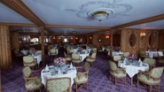 The restaurant was one of the most luxurious rooms on the ship, decorated in the Louis XVI style, with exquisitely carved French walnut paneling trimmed in gilt-brass accents. Fluted columns interspersed throughout the room were carved with gilded ribbons and the plaster ceilings were delicately molded with flower and ribbon motifs. Mirrors were installed within the paneling imitating windows and the room was divided into bays along either side with oval mirrors inset. Along the forward wall was a large buffet with a peach-colored marble top and along the aft wall was a raised bandstand for the orchestra, with buffets on either side containing the silver service and cutlery. The Restaurant featured its own custom Spode china service in gilt and cobalt blue. Axminster carpeting in Rose du Barry covered the floors and the plush chairs of French walnut were upholstered in pink rose-patterned Aubusson tapestry. The À la Carte Restaurant provided the most intimate atmosphere on board. In fact, half of the tables in the restaurant catered for two people, whereas very few of such tables were offered in the main dining saloon.
