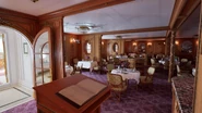 The restaurant had its own Reception Room located next to the Aft Grand Staircase on B Deck. That room was decorated in the Georgian style: featuring armchairs and settees draped in carmine-colored silk; and a space was reserved for the orchestra. It allowed passengers to gather together before and after their meals.