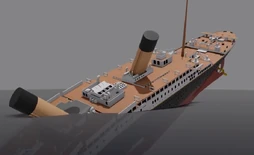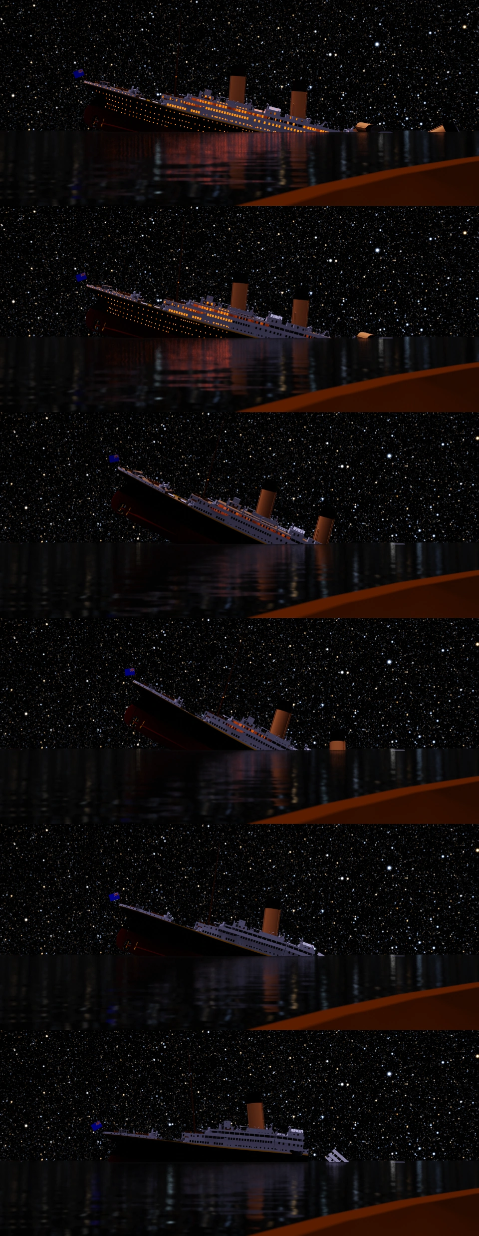 The ship reached 23 degrees when the lights went out and the ship breaks down to the keel. It splits in front of the third funnel and behind the already collapsed second funnel, sending the stern crashing down into the water. After that, the remaining funnels fall in opposite directions, with the third falling to starboard and the fourth landing on the boat deck. The bow sinks, pulling the stern with it, and then the double bottom fails, separating the already sunken bow from the partially sunken stern. The stern capsizes to port and begins to sink, becoming vertical just as it begins to slide under completely.