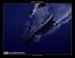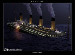 RMS Titanic breaking in half was an event during its sinking. It occurred just after the final plunge, when the ship suddenly broke into three individual sections,[1] the stern settled down into the water, and the bow section sank beneath the surface.[2][3][4][5][6]