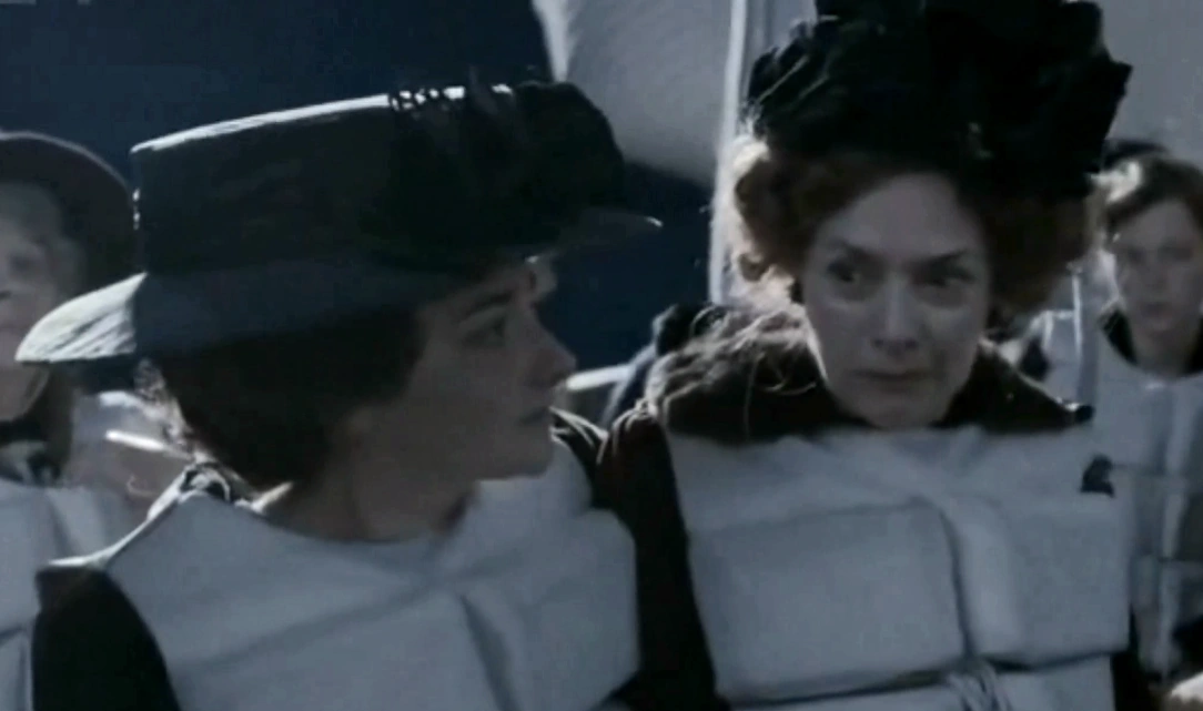 The Countess doesn't reappear for the rest of the film but she is seen from a distance holding the tillers of Lifeboat 8 during the sinking. She had filmed scenes aboard Carpathia along with Titanic Drunk, but neither made the cut.