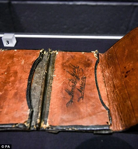 Mauritz Ådahl's wallet, as displayed at the National Maritime Museum in Falmouth, Cornwall, England.