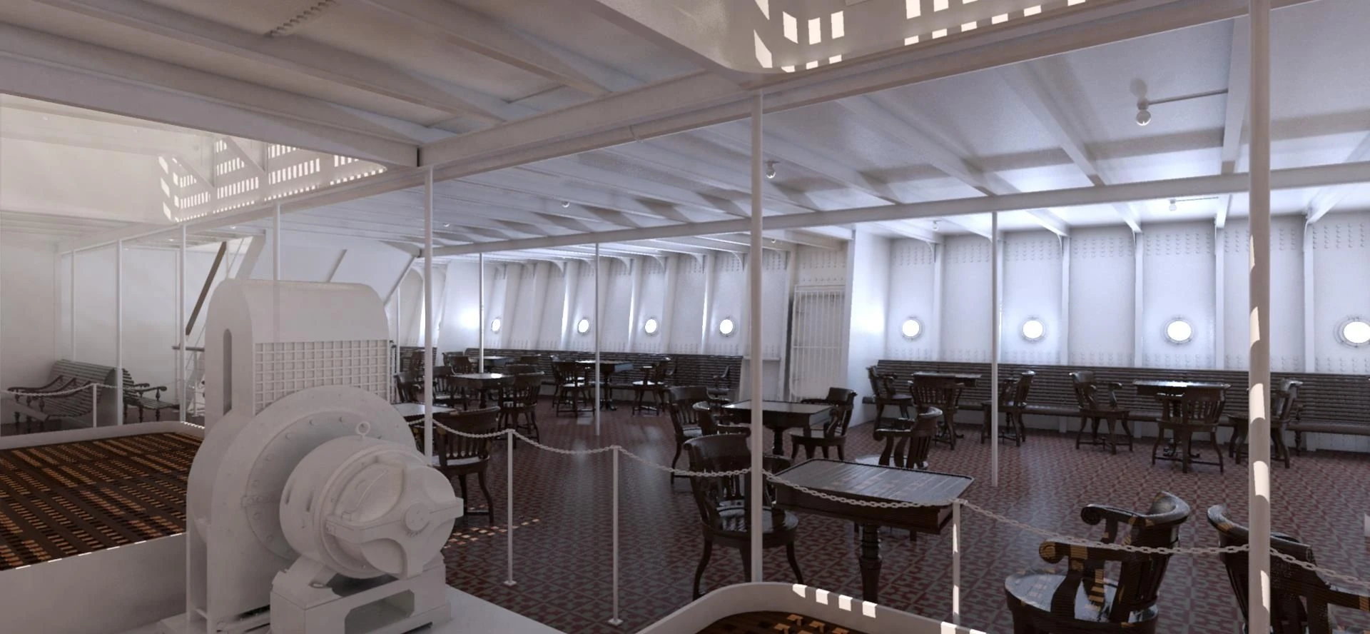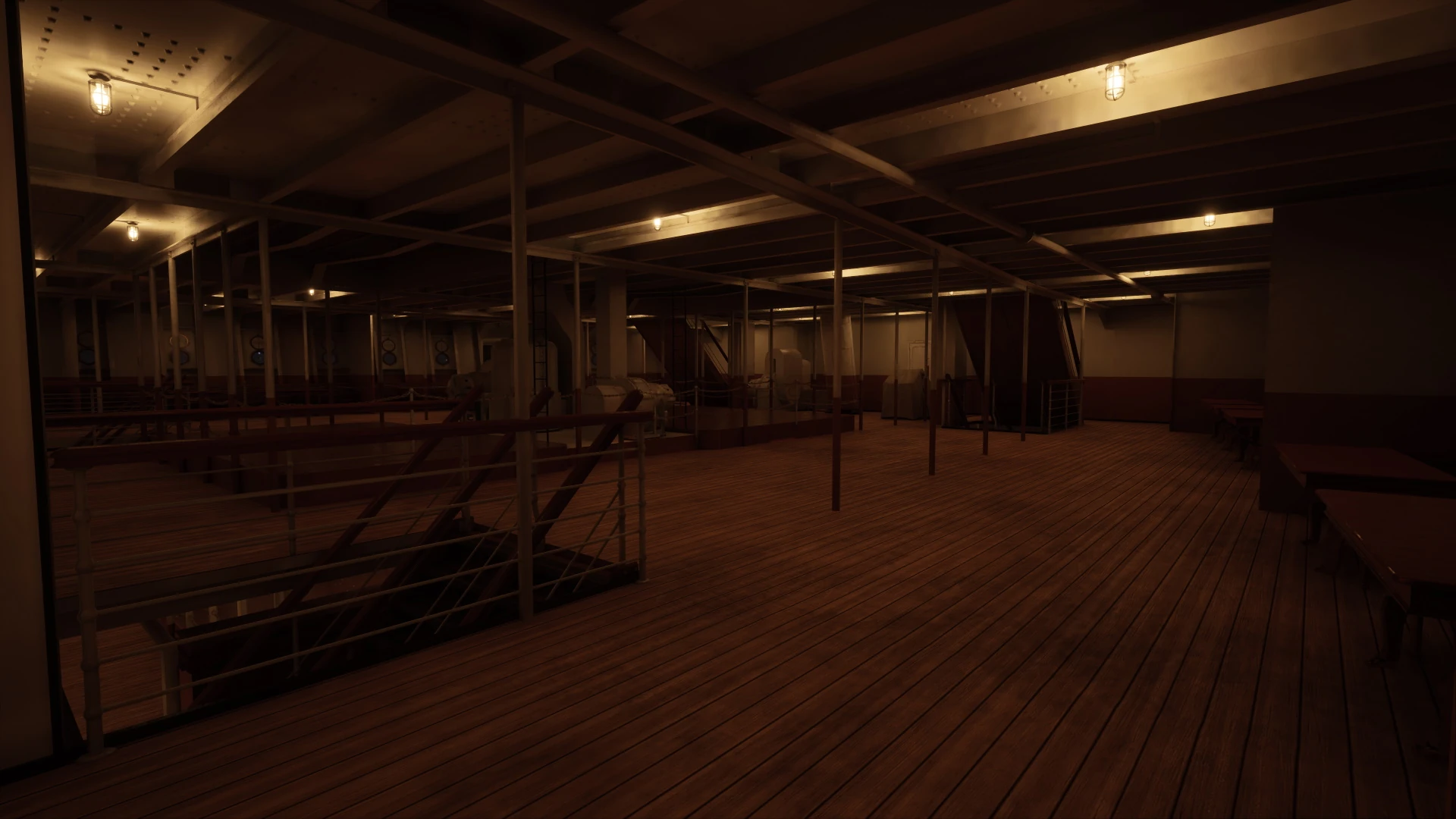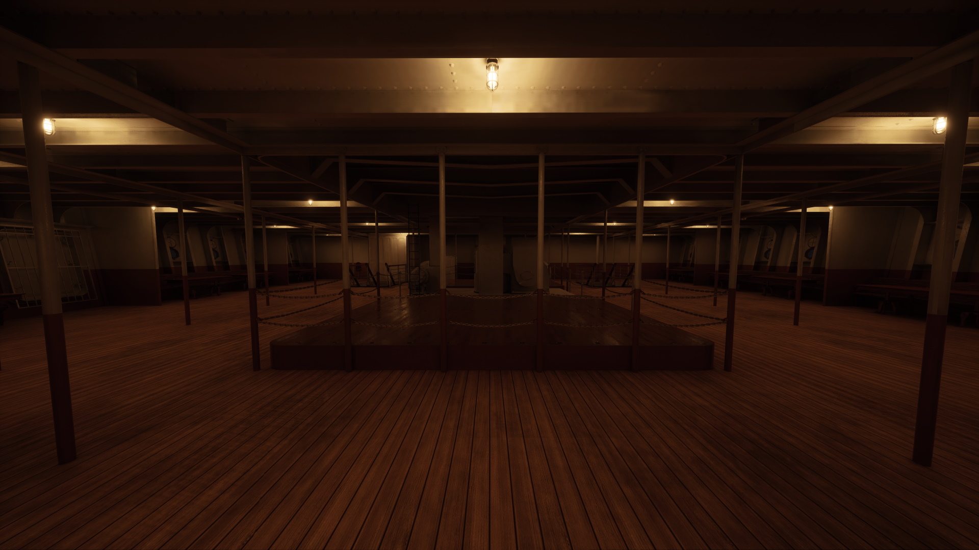 The Third Class Open Space was a very large room all the way forward in the ship on D-Deck, directly underneath the Forward Well Deck above. It could be entered from outside via two wide staircases off the good deck or from below via another set of staircases from E-Deck. While it had tables and chairs installed along the Port and Starboard sides, as the title suggests the room was mostly open space ideal for dances and socializing. There were a bar and numerous drinking fountains throughout the room.