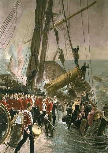 Thomas Hemy's famous painting of soldiers standing fast on HMS Birkenhead while the women and children head off in a lifeboat in the background